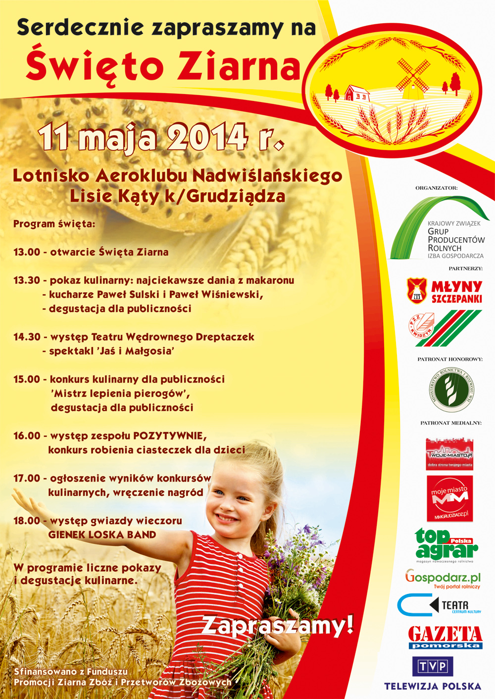 Firma PZZ w Kwidzynie zaprasza na swoje stoisko promocyjne podczas III ŚWIĘTA ZIARNA, które odbędzie się 11 maja 2014 na terenie lotniska Aeroklubu Nadwiślańskiego w Lisich Kątach k/Grudziądza. Święto Ziarna organizowane przez Krajowy Związek Grup Producentów Rolnych- Izbę Gospodarczą we współpracy z PZZ w Kwidzynie oraz Młynami Szczepanki to impreza finansowana z Funduszu Promocji Ziarna Zbóż i Przetworów Zbożowych. Ma na celu promocję i upowszechnienie spożycia przetworów zbożowych, a także uświadomienie konsumentom ich znaczenia zdrowotnego w codziennej diecie. Całodziennemu piknikowi będzie towarzyszył ciekawy program artystyczny, w którym nie zabraknie występu gwiazdy wieczoru, Gienek Loska Band, i atrakcji dla dzieci (wesołe miasteczko, spektakl ‘Jaś i Małgosia’, konkursy wypiekania ciasteczek). Pokazy kulinarne i degustacje dla publiczności oraz stoiska promocyjne wystawców z licznymi atrakcjami to znak firmowy Święta Ziarna. Serdecznie zapraszamy!